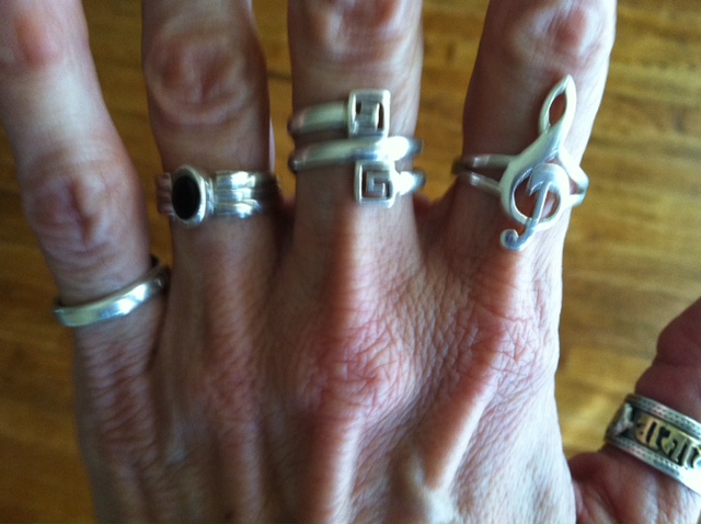 And on my thumb, I have an “om mani padme hum” – lotus rising out of the mud ring because it was a squeeze ring that was adjustable and could therefore fit over my big thumb knuckle (some decisions are ultimately just practical).